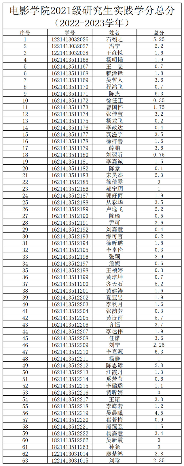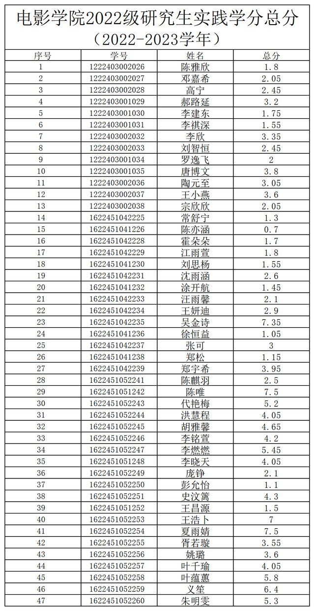2022-2023学年太阳成城集团研究生实践学分经各部门汇总,经员工自查、申诉,经太阳成城集团研究生实践学分评审小组对申诉材料进行复核、评定,现将实践学分总分予以公示。